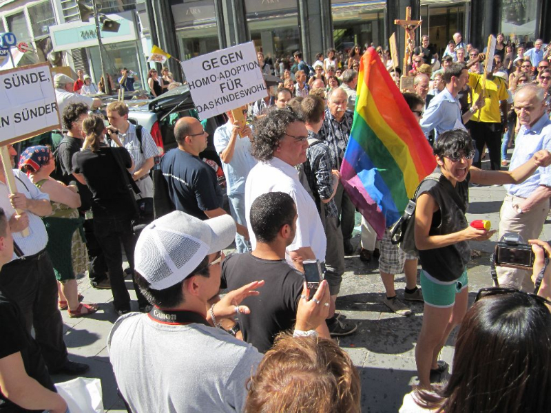 Als wir um 16:00 am Stephansplatz ankamen, hatten die etwa 20 bis 25 KatholikInnen (teilweise noch Kinder) von gloria.tv ihre Stellung schon bezogen. Sie waren allerdings nicht allein: etwa 100 Menschen verschiedenster Organisationen sowie PassantInnen hatten sie bereits eingekreist. Wir gesellten uns dazu und die knarzenden Lautsprecher der FundamentalistInnen hatten in Folge keine Chance gegen das Pfeifkonzert der Menge. Etwa um 17:30 trafen weitere PolizistInnen ein und trennten nach und nach Demo und Gegendemo mehr schlecht als Recht auf. Schließlich zogen die KatholikInnen in Richtung Oper ab, gefolgt von der mittlerweile auf etwa 150 Menschen angewachsenen Gegendemonstration. Auch wenn am Weg zur Oper ein paar GegendemonstrantInnen verloren gingen und kreative Wegfindung zum Umgehen von eilig formierten Absperrungen der Polizei notwendig waren, kamen wir letztlich alle vor dem Operngebäude wieder zusammen. Auch hier gingen die Ave Marias der homophoben FundamentalistInnen in Buh-Rufen und Pfiffen unter und die Gegendemonstration hielt trotz beißender Hitze bis zum Abzug des Grüppchens von Gloria.tv tapfer aus. Zusammenfassend kann gesagt werden: An diesem Samstag wurde deutlich gezeigt, dass Homophobie in dieser Gesellschaft und in diesem Jahrhundert absolut keinen Platz mehr hat.