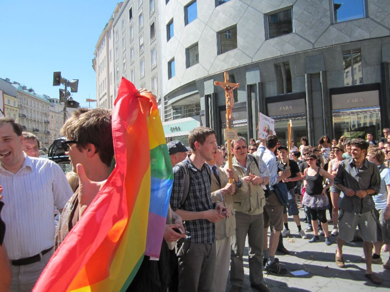 Anlässlich der jährlichen Regenbogenparade hatte es sich eine Gruppe christlich-religiöser FundamentalistInnen in den Kopf gesetzt, Am Stephansplatz und bei der Oper ihr Missfallen über den „moralischen Verfall“ kundzutun. Das konnten wir natürlich nicht einfach so stehen lassen und so mobilisierten wir gemeinsam mit anderen Organisationen zur Gegenkundgebung!