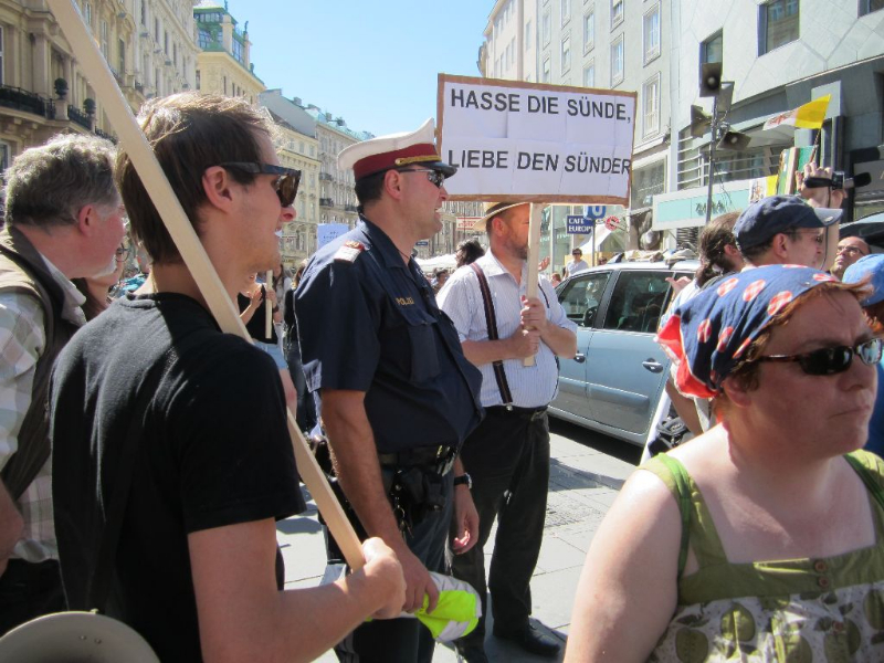 Anlässlich der jährlichen Regenbogenparade hatte es sich eine Gruppe christlich-religiöser FundamentalistInnen in den Kopf gesetzt, Am Stephansplatz und bei der Oper ihr Missfallen über den „moralischen Verfall“ kundzutun. Das konnten wir natürlich nicht einfach so stehen lassen und so mobilisierten wir gemeinsam mit anderen Organisationen zur Gegenkundgebung!