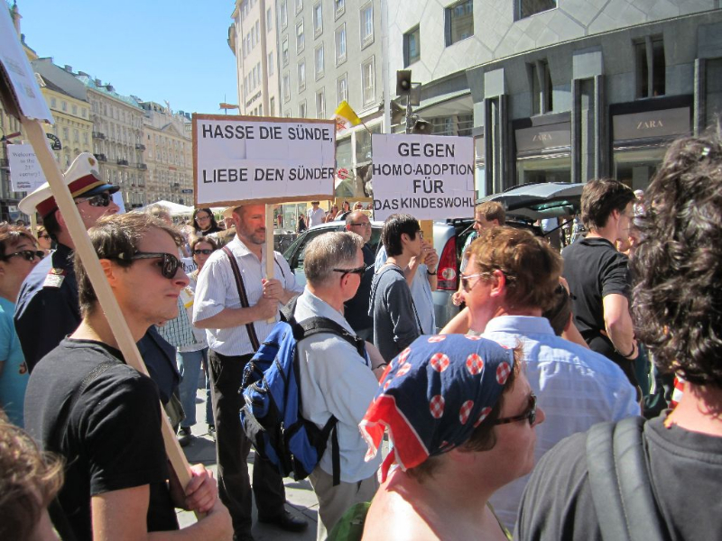 Anlässlich der jährlichen Regenbogenparade hatte es sich eine Gruppe christlich-religiöser FundamentalistInnen in den Kopf gesetzt, Am Stephansplatz und bei der Oper ihr Missfallen über den „moralischen Verfall“ kundzutun. Das konnten wir natürlich nicht einfach so stehen lassen und so mobilisierten wir gemeinsam mit anderen Organisationen zur Gegenkundgebung!