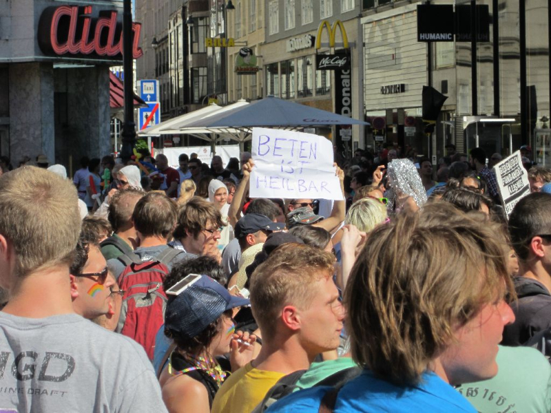 Anlässlich der jährlichen Regenbogenparade hatte es sich eine Gruppe christlich-religiöser FundamentalistInnen in den Kopf gesetzt, Am Stephansplatz und bei der Oper ihr Missfallen über den „moralischen Verfall“ kundzutun. Das konnten wir natürlich nicht einfach so stehen lassen und so mobilisierten wir gemeinsam mit anderen Organisationen zur Gegenkundgebung!