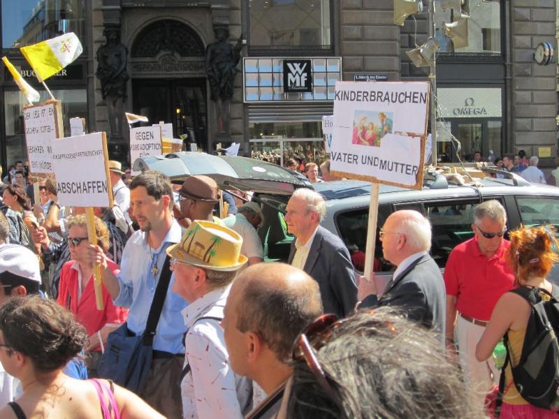 Als wir um 16:00 am Stephansplatz ankamen, hatten die etwa 20 bis 25 KatholikInnen (teilweise noch Kinder) von gloria.tv ihre Stellung schon bezogen. Sie waren allerdings nicht allein: etwa 100 Menschen verschiedenster Organisationen sowie PassantInnen hatten sie bereits eingekreist. Wir gesellten uns dazu und die knarzenden Lautsprecher der FundamentalistInnen hatten in Folge keine Chance gegen das Pfeifkonzert der Menge. Etwa um 17:30 trafen weitere PolizistInnen ein und trennten nach und nach Demo und Gegendemo mehr schlecht als Recht auf. Schließlich zogen die KatholikInnen in Richtung Oper ab, gefolgt von der mittlerweile auf etwa 150 Menschen angewachsenen Gegendemonstration. Auch wenn am Weg zur Oper ein paar GegendemonstrantInnen verloren gingen und kreative Wegfindung zum Umgehen von eilig formierten Absperrungen der Polizei notwendig waren, kamen wir letztlich alle vor dem Operngebäude wieder zusammen. Auch hier gingen die Ave Marias der homophoben FundamentalistInnen in Buh-Rufen und Pfiffen unter und die Gegendemonstration hielt trotz beißender Hitze bis zum Abzug des Grüppchens von Gloria.tv tapfer aus. Zusammenfassend kann gesagt werden: An diesem Samstag wurde deutlich gezeigt, dass Homophobie in dieser Gesellschaft und in diesem Jahrhundert absolut keinen Platz mehr hat.