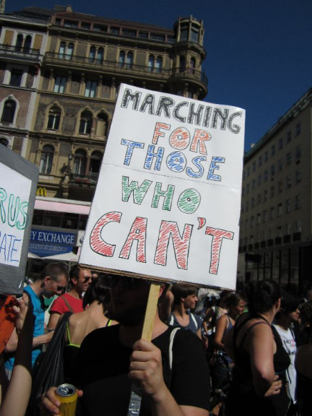 Als wir um 16:00 am Stephansplatz ankamen, hatten die etwa 20 bis 25 KatholikInnen (teilweise noch Kinder) von gloria.tv ihre Stellung schon bezogen. Sie waren allerdings nicht allein: etwa 100 Menschen verschiedenster Organisationen sowie PassantInnen hatten sie bereits eingekreist. Wir gesellten uns dazu und die knarzenden Lautsprecher der FundamentalistInnen hatten in Folge keine Chance gegen das Pfeifkonzert der Menge. Etwa um 17:30 trafen weitere PolizistInnen ein und trennten nach und nach Demo und Gegendemo mehr schlecht als Recht auf. Schließlich zogen die KatholikInnen in Richtung Oper ab, gefolgt von der mittlerweile auf etwa 150 Menschen angewachsenen Gegendemonstration. Auch wenn am Weg zur Oper ein paar GegendemonstrantInnen verloren gingen und kreative Wegfindung zum Umgehen von eilig formierten Absperrungen der Polizei notwendig waren, kamen wir letztlich alle vor dem Operngebäude wieder zusammen. Auch hier gingen die Ave Marias der homophoben FundamentalistInnen in Buh-Rufen und Pfiffen unter und die Gegendemonstration hielt trotz beißender Hitze bis zum Abzug des Grüppchens von Gloria.tv tapfer aus. Zusammenfassend kann gesagt werden: An diesem Samstag wurde deutlich gezeigt, dass Homophobie in dieser Gesellschaft und in diesem Jahrhundert absolut keinen Platz mehr hat.