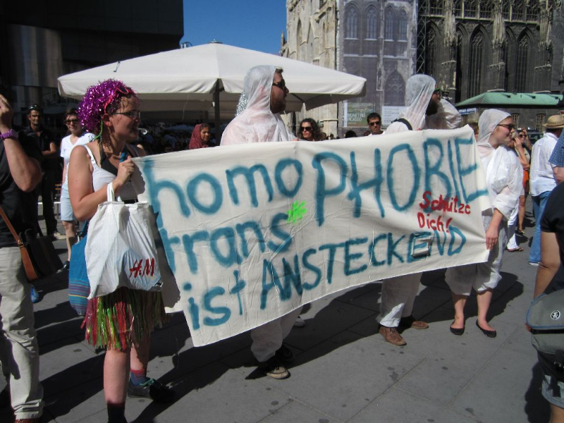 Anlässlich der jährlichen Regenbogenparade hatte es sich eine Gruppe christlich-religiöser FundamentalistInnen in den Kopf gesetzt, Am Stephansplatz und bei der Oper ihr Missfallen über den „moralischen Verfall“ kundzutun. Das konnten wir natürlich nicht einfach so stehen lassen und so mobilisierten wir gemeinsam mit anderen Organisationen zur Gegenkundgebung!