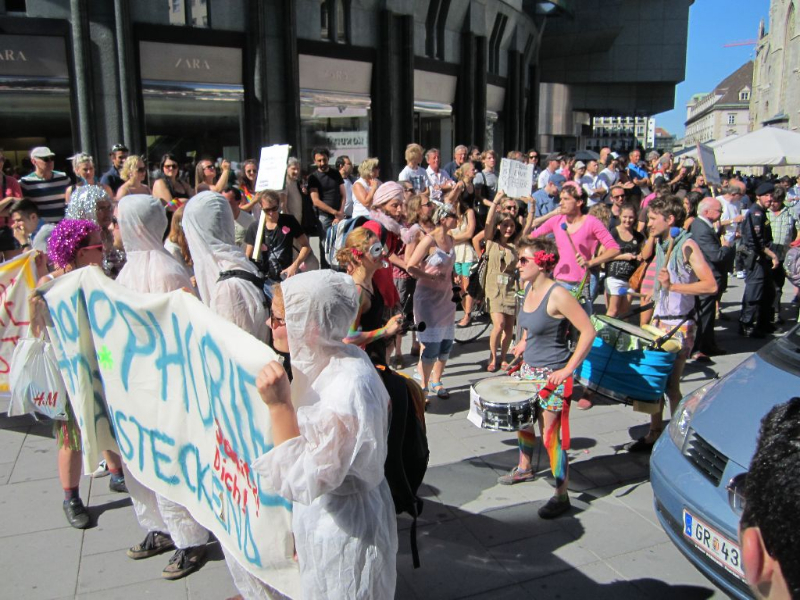 Als wir um 16:00 am Stephansplatz ankamen, hatten die etwa 20 bis 25 KatholikInnen (teilweise noch Kinder) von gloria.tv ihre Stellung schon bezogen. Sie waren allerdings nicht allein: etwa 100 Menschen verschiedenster Organisationen sowie PassantInnen hatten sie bereits eingekreist. Wir gesellten uns dazu und die knarzenden Lautsprecher der FundamentalistInnen hatten in Folge keine Chance gegen das Pfeifkonzert der Menge. Etwa um 17:30 trafen weitere PolizistInnen ein und trennten nach und nach Demo und Gegendemo mehr schlecht als Recht auf. Schließlich zogen die KatholikInnen in Richtung Oper ab, gefolgt von der mittlerweile auf etwa 150 Menschen angewachsenen Gegendemonstration. Auch wenn am Weg zur Oper ein paar GegendemonstrantInnen verloren gingen und kreative Wegfindung zum Umgehen von eilig formierten Absperrungen der Polizei notwendig waren, kamen wir letztlich alle vor dem Operngebäude wieder zusammen. Auch hier gingen die Ave Marias der homophoben FundamentalistInnen in Buh-Rufen und Pfiffen unter und die Gegendemonstration hielt trotz beißender Hitze bis zum Abzug des Grüppchens von Gloria.tv tapfer aus. Zusammenfassend kann gesagt werden: An diesem Samstag wurde deutlich gezeigt, dass Homophobie in dieser Gesellschaft und in diesem Jahrhundert absolut keinen Platz mehr hat.