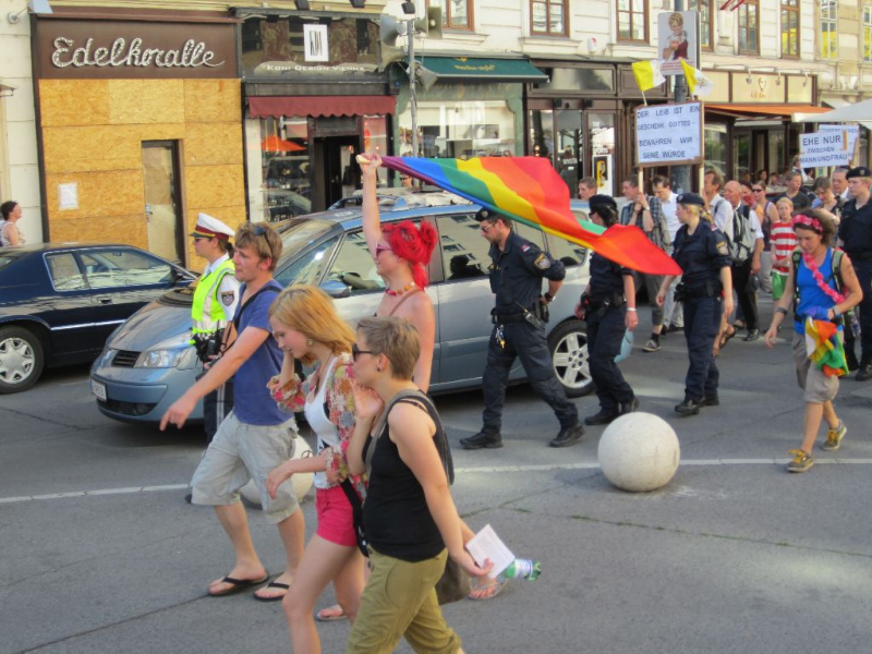 Anlässlich der jährlichen Regenbogenparade hatte es sich eine Gruppe christlich-religiöser FundamentalistInnen in den Kopf gesetzt, Am Stephansplatz und bei der Oper ihr Missfallen über den „moralischen Verfall“ kundzutun. Das konnten wir natürlich nicht einfach so stehen lassen und so mobilisierten wir gemeinsam mit anderen Organisationen zur Gegenkundgebung!